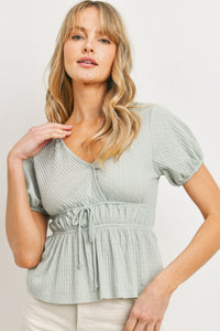 Introducing our Front Tie Cut Edge Top, made in the U.S.A and available in S, M, and L sizes. This trendy top features a surplice neckline, short sleeves, ribbed fabric, front tie on the waist, and a raw hemline for a stylish and chic look. Crafted from a comfortable blend of 90% Polyester and 10% Spandex.