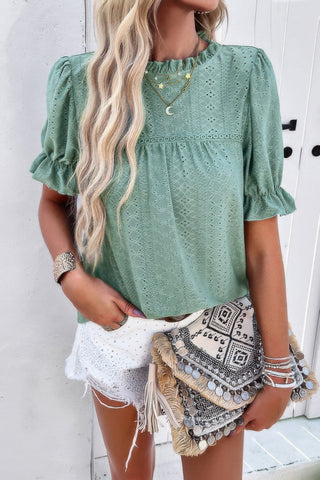 Round Neck Embroidery Ruffle Sleeve Loose Fit Shirt