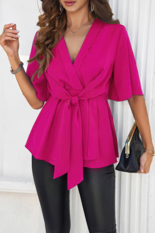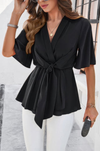 Product Description: Feminine and flattering, this peplum shirt features a classic V-neck and short bell sleeves for a soft, romantic look. The front tie detail adds a cinched waist effect, creating a graceful silhouette. Made from lightweight polyester, it drapes beautifully and is perfect for transitional seasons. Its easy-to-style shape works well for both casual and more polished occasions. Whether paired with denim or skirts, this top brings charm and confidence to your ensemble.