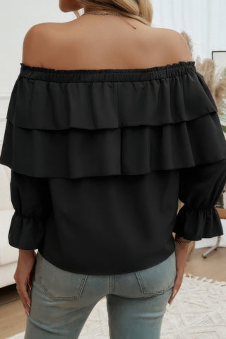 Product Description: Bring movement and charm to your wardrobe with this tiered ruffle blouse. The drawstring ruched neckline adds a customizable touch, while bell sleeves lend a romantic and airy feel. Made from lightweight polyester, it's breathable and ideal for warmer days or layering under jackets. The tiered structure adds visual interest and a hint of volume, perfect for pairing with slim trousers or denim. Whether worn for a casual day out or an afternoon lunch, this blouse adds polish to any look.