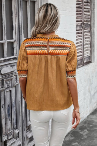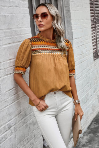 Product Description: This geometric print elegant textured puff sleeve shirt is a refined yet playful addition to your casual wardrobe. Made from a blend of 95% polyester and 5% elastane, it offers a soft, stretchy feel that ensures all-day comfort. The geometric print brings a modern edge, while the puff short sleeves add a subtle touch of femininity and sophistication. Its lightly textured finish gives it a unique, elevated look, making this shirt perfect for casual outings, vacation getaways, or daily wear. Pair it with your favorite jeans or trousers for a chic, polished ensemble.