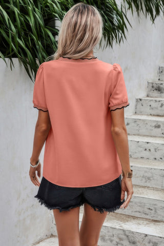 Product Description: Refined and effortlessly stylish, this V-neck short sleeve shirt stands out with its sleek contrast trim. The tailored silhouette and polished neckline give it an elevated feel, perfect for both casual days and more dressed-up occasions. Crafted from lightweight 100% polyester, it offers a smooth finish and easy wear throughout the day. The short sleeves keep it seasonally versatile, while the contrast detail adds a modern, crisp touch. Whether paired with trousers for work or denim for weekends, this shirt delivers understated elegance.