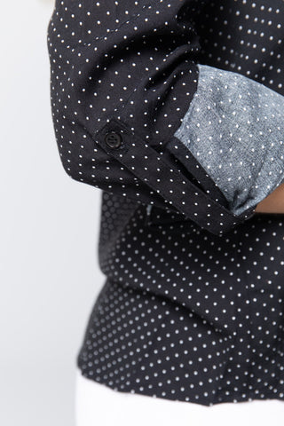 Enhance your style with our 3/4 Roll Up Sleeve Dot Print Shirt in Black/Off White. Add it to your cart now for a timeless and versatile addition to your fashion collection!