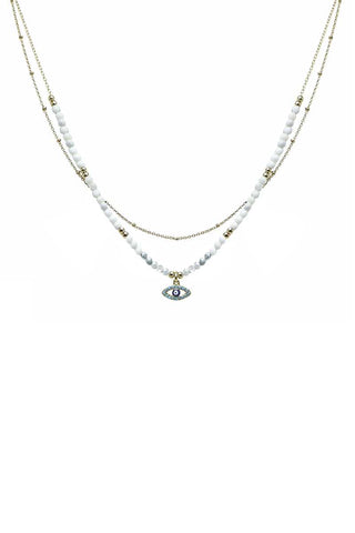 2 Layered Metal Seed Bead Evil Eye Pendant Necklace - White